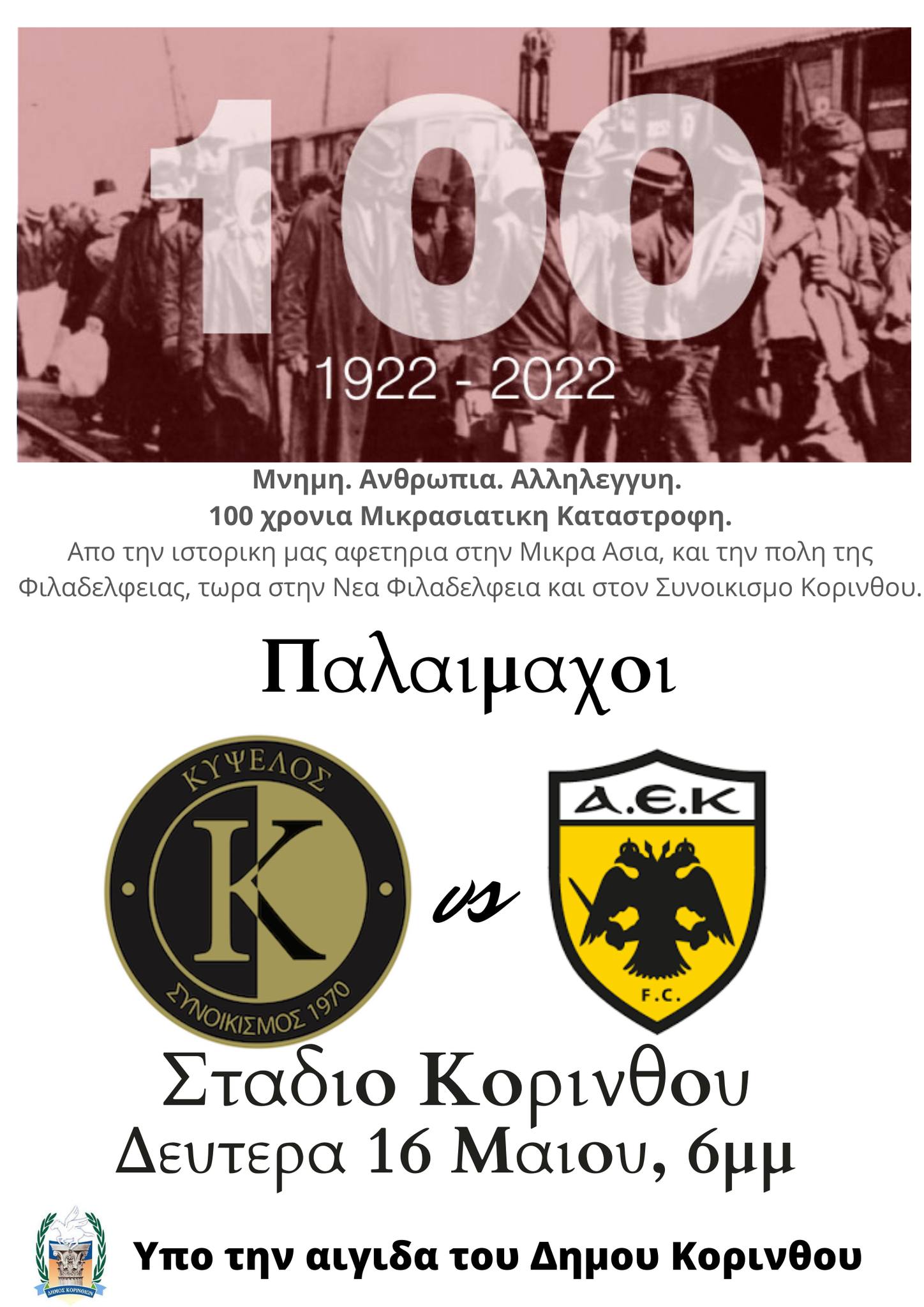 Τη Δευτέρα 16 Μαΐου στις 6μμ στο στάδιο Κορίνθου, υπό την αιγίδα του Δήμου, θα διεξαχθεί ποδοσφαιρικός αγώνας με αφορμή τα 100 χρόνια από τη Μικρασιατική καταστροφή.