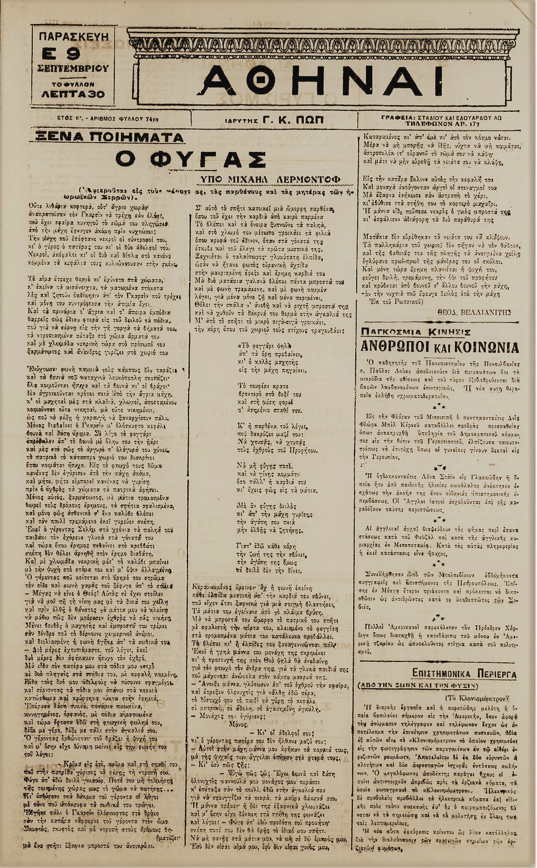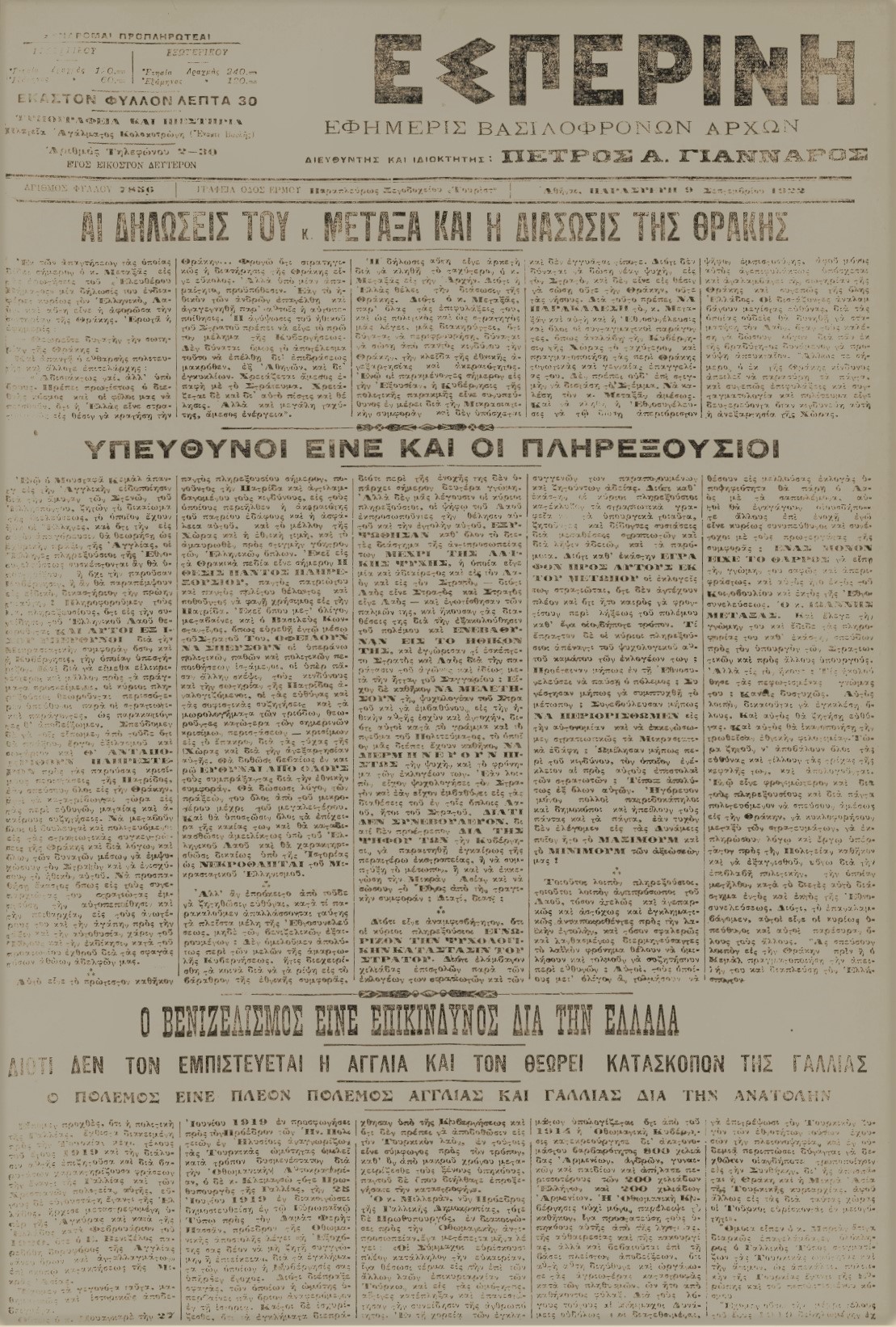 «Ευρισκόμεθα σχεδόν εν παντελεί διωγμώ. Ο βενιζελικός Τύπος μας παρουσιάζει καθ’ εκάστην την εικόνα του μισελληνισμού με τα μελανώτερα χρώματα. Ο Κεμαλισμός των Παρισίων γαυριά εκ χαιρεκακίας και μίσους. Και ημείς εδώ αναμένομεν να μας σώση η Κυβέρνησις των γερόντων! Είνε ανάγκη να έλθη το ταχύτερον Κυβέρνησις Μεταξά. Είνε ανάγκη ΤΑ ΕΝΑΠΟΜΕΙΝΑΝΤΑ ΠΟΛΙΤΙΚΑ ΣΤΟΙΧΕΙΑ του Τόπου ν’ αναλάβουν την Εξουσίαν (…) διά την αποκατάστασιν της εθνικής τιμής και διά την τελικήν νίκην, η οποία θα τερματισθή μόνον όταν εισέλθωμεν εις την Πόλιν»
