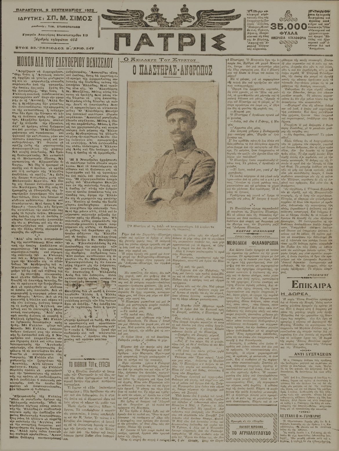 «Η παρούσα ώρα είνε ώρα του κ. Βενιζέλου. […] Δυστυχώς η Κυβέρνησις, θύμα των παρασκηνιακών ενεργειών των εργατών της μικρασιατικής ατυχίας, διστάζει και αναβάλλει. Και μελετά την επιβολήν στρατιωτικού νόμου, διά να πνίξη κάθε κραυγήν αγωνίας, κάθε φωνήν του λαού. Και αποφασίζει το μέλλον της Ελλάδος, χωρίς ν’ ακουσθή ο λόγος εκείνων, οι οποίοι θα ηδύναντο να την σώσουν από την πλήρη καταστροφήν»