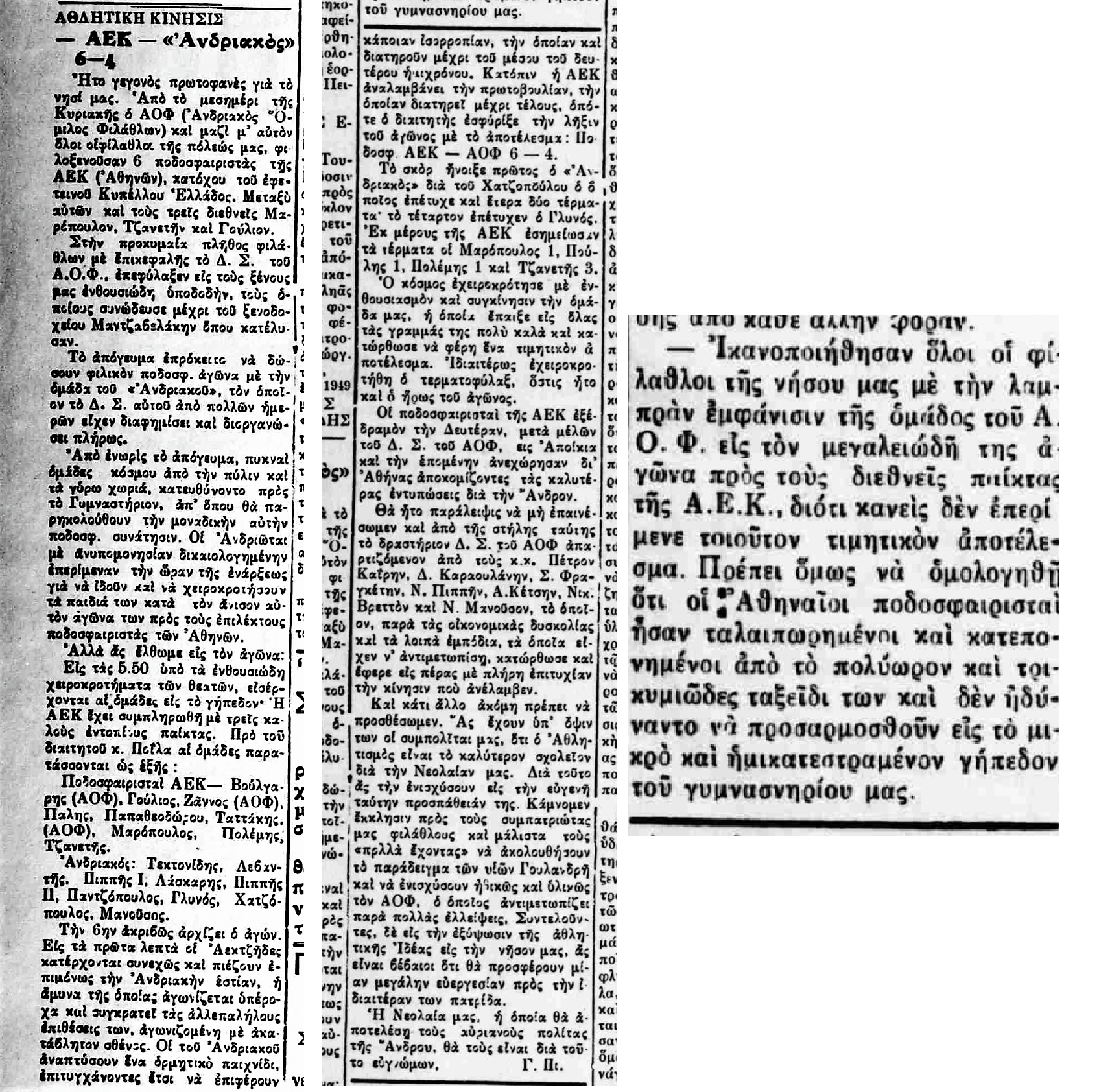 26-8-1949 «ΑΕΚ-Ανδριακός: 6-4. Ήτο πρωτοφανές για το νησί μας. Από το μεσημέρι της Κυριακής ο ΑΟΦ (Ανδριακός Όμιλος Φιλάθλων) και μαζί με αυτόν όλοι οι φίλαθλοι της πόλεώς μας φιλοξενούσαν 6 ποδοσφαιριστάς της ΑΕΚ (Αθηνών), κατόχου του εφετεινού Κυπέλλου Ελλάδος. Μεταξύ αυτών και τους τρείς διεθνείς Μαρόπουλον, Τζανετήν και Γούλιον. Στην προκυμαία πλήθος φιλάθλων με επικεφαλής το Δ.Σ. του ΑΟΦ επεφύλαξεν εις τους ξένους μας ενθουσιώδη υποδοχήν, τους οποίους συνόδευσε μέχρι του ξενοδοχείου Μαντζεβελάκην όπου κατέλυσαν. Το απόγευμα επρόκειτο να δώσουν φιλικόν ποδοσφαιρικό αγώνα με την ομάδα του Ανδριακού, τον οποίο το Δ.Σ. αυτού από πολλών ημερών είχε διαφημίσει και διοργανώσει πλήρως. Από ενωρίς το απόγευμα, πυκναί ομάδες κόσμου από την πύλιν και τα γύρω χωριά κατευθύνοντο προς το γυμναστήριον, απ’ όπου θα παρηκολούθουν την μοναδικήν αυτήν συνάντησιν. Οι Ανδριώται με ανυπομονησίαν δικαιολογημένης επερίμεναν την ώραν της ενάρξεως για να ιδούν τα παιδιά των κατά τον άνισον αυτό αγώνα προς τους επιλέκτους ποδοσφαιριστάς των Αθηνών. Αλλά ας έλθωμε εις τον αγώνα: Εις τας 5.50μμ υπό τα ενθουσιώδη χειροκροτήματα των θεατών, εισέρχονται αι ομάδες εις το γήπεδον. Η ΑΕΚ έχει συμπληρωθή με τρείς καλούς εντόπιους παίκτας. Πρό του διαιτητού κ. Ποΐλα αι ομάδες παρατάσσονται ως εξής: Ποδοσφαιρισταί ΑΕΚ: Βούλγαρης (ΑΟΦ), Γούλιος, Ζάννος (ΑΟΦ), Πάλης, Παπαθεοδώρου, Ταττάκης (ΑΟΦ), Μαρόπουλος, Πολέμης, Τζανετής.