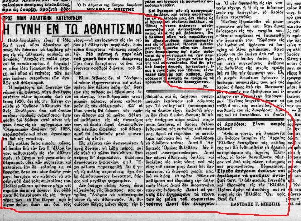 Σε δημοσίευμα της 3-9-1932 στην εφημερίδα ΑΝΔΡΙΩΤΗΣ με τίτλο «Η γυνή εν τω αθλητισμώ» και υπέρτιτλο «Προς μίαν αθλητικήν κατεύθυνσιν», επιχειρηματολογεί υπέρ της μαζικής εισόδου των γυναικών στον αθλητισμό. Παρουσιάζει τη διεθνή εικόνα και τα βήματα που έχουν γίνει, εγκωμιάζει τη γυναικεία φύση για τις αρετές που έχει και τις δυνατότητες που δίνει στον αθλητισμό. Παράλληλα καυτηριάζει τις σε μεγάλη κλίμακα εκείνη την εποχή, συντηρητικές αντιλήψεις που θέλουν τη γυναίκα να απέχει από τους στίβους, γιατί η αθλητική περιβολή, από αρκετούς, ειδικά τους γονείς, θεωρείται «άσεμνη» και εμποδίζουν τις κόρες τους να ασχοληθούν με τα σπορ. Δίνει στον Ανδριακό Όμιλο Φιλάθλων την προτροπή να ασχοληθεί με το θέμα αυτό.