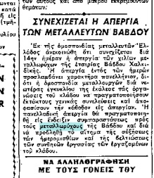 Κατ’ ανακοίνωσις της ομοσπονδίας μεατλλευτών Ελλάδος, η απεργία των χιλίων μεταλλωρύχων της Βάβδου συνεχίζεται φια 18ην ημέραν. Εν τω μεταξύ κατόπιν διαβήματος της ομοσπονδίας ανεχώρησε δια Βάβδον, ο διευθυντής του υπουργείου εργασίας κ. Κ. Γρίβας, προκειμένου να προβή εις έλεγχον επί γενομένων καταγγελιών δια σειρά παραβάσεων. Συγκεκριμένος κατηγγέλθη ότι η επιχείρησης χρησιμοποιεί ως απεργοσπάστας παιδιά ηλικίας 12-14 ετών, τα οποία απασχολούνται εις βαρείας και ανθυγιεινάς εργασίας.