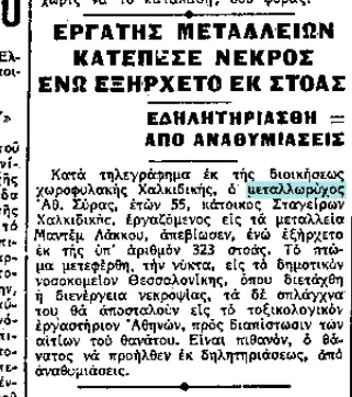 Δημοσίευμα της 2/9/1964 εφημερίδα ΜΑΚΕΔΟΝΙΑ: « Εργάτης μεταλλείων κατέπεσε νεκρός ενώ εξήρχετο εκ στοάς. Εδηλητηριάσθη από αναθυμιάσεις. Κατά τηλεγράφημα εκ της διοικήσεως χωροφυλακής Χαλκιδικής, ο μεταλλωρύχος Αθ. Σύρας ετών 55 κάτοικος Σταγείρων Χαλκιδικής, εργαζόμενος εις τα μεταλλεία Μάντεμ Λάκκου, απεβίωσεν ενώ εξήρχετι εκ της υπ΄αριθμόν 323 στοάς. Το πτώμα μετεφέρθη την νύκτα, εις το δημοτικόν νοσοκομείον Θεσσαλονίκης, όπου διετ΄χθη η διενέργεια νεκροψίας, τα δε σπλάγχνα του θα αποσταλούν εις το τοξικολογικόν εργαστήριον Αθηνών, προς διαπίστωσιν των αιτιών του θανάτου. Είναι πιθανόν ο θάνατος να προήλθεν εκ δηλητηριάσεως, από αναθυμιάσεις».