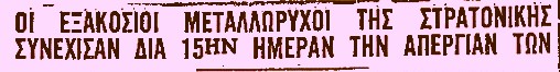 Δημοσίευμα της 14/10/1964 της εφημερίδας ΜΑΚΕΔΟΝΙΑ: «Οι εξακόσιοι μεταλλωρύχοι της Στρατονίκης συνέχισαν δια 15ην ημέραν την απεργίαν των. Υπό της ομοσπονδίας μεταλλευτών Ελλάδος ανεκοινώθη ότι η απεργία των 600 μεταλλωρύχων της Στρατονίκης Χαλκιδικής συνεχίσθη δια 15ην ημέραν, με καθολικήν συμμετοχήν του εργατικού προσωπικού της εταιρίας λιπασμάτων, συνεπεία αρνήσεως της διευθύνσεως της επιχειρήσεως να δεχθή την επίλυσίν των αιτημάτων των εργατών, ήτοι την αύξησιν των αποδοχών παραγωγής και την βελτίωσιν των συνθηκών εργασίας των εντός και εκτός των στοών εργαζομένων μεταλλωρύχων.
