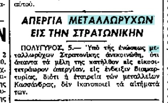 Δημοσίευμα της 6/9/1964 της εφημερίδας ΜΑΚΕΔΟΝΙΑ: «Υπό της ενώσεως μεταλλωρύχων Στρατονίκης ανεκοινώθη, ότι άπαντα τα μέλη της κατήλθαν εις εικοσιτετράωρον απεργίαν, εις ένδειξίν διαμαρτυρίας, διότι η εταιρεία των μεταλλείων Κασσάνδρας, δεν ικανοποιεί τα αιτήματά των».