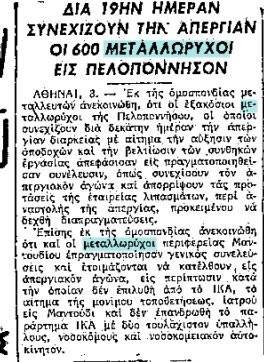 Εκ της ομοσπονδίας μεταλλευτών ανεκοινώθη ότι οι εξακόσιοι μεταλλωρύχοι της Πελοποννήσου, οι οποίοι συνεχίζουν δια δεκάτην ημέραν την απεργίαν διαρκείας με αίτημα την αύξησιν των αποδοχών και την βελτίωσιν των συνθηκών εργασίας, απεφάσισαν εις πραγματοποιηθείσαν συνέλευσιν, όπως συνεχίσουν τον απεργιακόν αγώνα και απορρίψουν τας προτάσεις της εταιρείας λιπασμάτων, περί αναστολής της απεργίας, προκειμένου να δεχθή διαπραγματεύσεις.