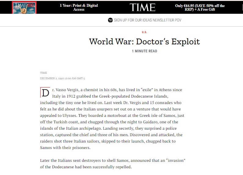 ΣΣ. Πρόκειται περί της μεγάλης εκστρατείας του Δωδεκανησίου ιατρού κ. Βάσου Βεργή, ο οποίος δι’ ενός βενζινοπλοίου και 15 Δωδεκανησίων πολιτών επέδραμον κατά της νήσου, προσέβαλαν τη φρουρά της, εφόνευσαν τρείς καραμπινιέρους, συνέλαβαν τον σταθμάρχην και τρείς στρατιώτας μετά του οπλισμού των και απήγαγον αυτούς ως αιχμαλώτους, τους οποίους ανενόχλητοι μετέφερον εις την βάσιν των. Περί αυτής της εξορμήσεως πρόκειται, εναντίον της οποίας εξεστράτευσεν ολόκληρος η Ιταλία με τας ναυτικάς, τας στρατιωτικάς και τας αεροπορικάς της δυνάμεις.