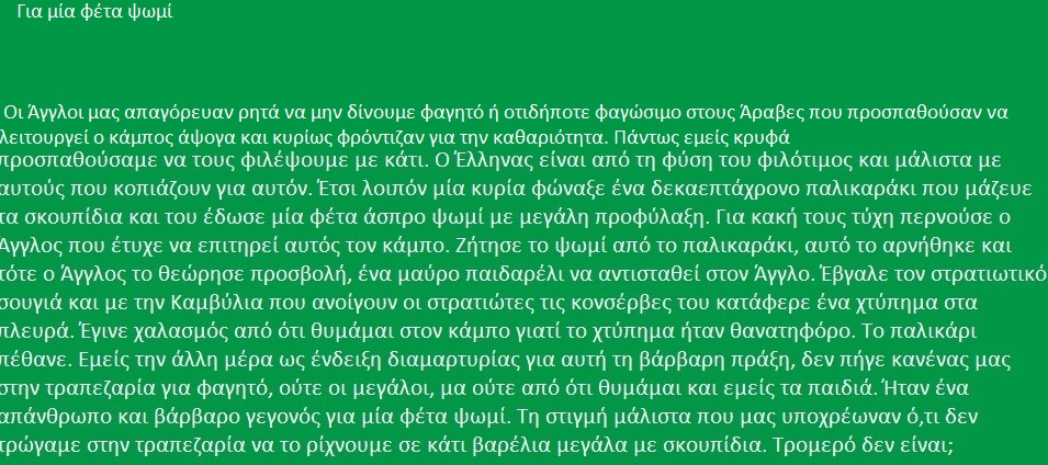 Στη διήγησή της θα δείτε λίγα ανδρικά ονόματα, που αντιστοιχούν σε μικρά παιδιά και ηλικιωμένους, αφού οι υπόλοιποι με όριο ηλικίας στράτευσης τα 16 χρόνια, κατατάσσονταν στις συμμαχικές δυνάμεις της Μέσης Ανατολής για να πολεμήσουν. Μεταξύ αυτών και αρκετές γυναίκες κυρίως ως νοσοκόμες.