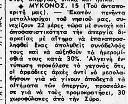Δημοσίευμα της ΑΥΓΗΣ στις 16 Μαρτίου 1965: «Εκατόν πενήντα μεταλλωρύχοι του νησιού μας, συνεχίζουν 22 μέρες τώρα με συνοχή και αποφασιστικότητα την απεργία διαρκείας με αίτημα να επαναπροσληφθεί ένας απολυθείς συνάδελφός τους και να αυξηθούν τα ημερομίσθιά τους κατά 30%. Αλγεινή εντύπωση προκάλεσε το γεγονός ότι οι αρμόδιες αρχές αντί να μεσολαβήσουν για να γίνουν αποδεχτά τα αιτήματα των απεργών, προσκάλεσε για να τους τρομοκρατήσει, 30 χωροφύλακες από την Σύρο».