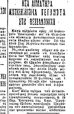 Τα εμπρηστικά δημοσιεύματα συνεχίζονται όπου αντί να καταδικάσουν τα έκτροπα, τα διανθίζουν με όποιο τρόπο μπορούν ενώ τα διευθυντικά στελέχη των εφημερίδων «μετακομίζουν» από άλλα ρεπορτάζ – κυρίως απεργιακά – τους κομμουνιστές που τους κατηγορούσαν σαν ταραχοποιούς των εργατικών δραστηριοτήτων και τους «τοποθετούν» στους αναμεμιγμένους στα επεισόδια μεταξύ χριστιανών και εβραίων.