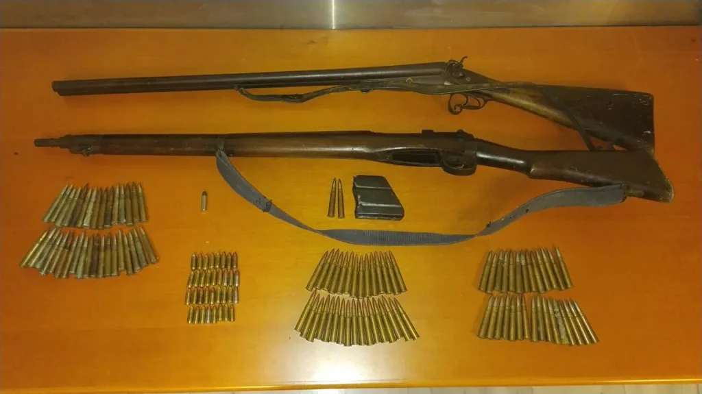 Από τις έρευνες, μεταξύ άλλων, βρέθηκαν και κατασχέθηκαν πολεμικό τυφέκιο με γεμιστήρα, δίκαννο, 2 καραμπίνες, από τις οποίες η μία χωρίς σειριακό αριθμό, 145 φυσίγγια και 9 μαχαίρια, τα οποία θα αποσταλούν για εργαστηριακή εξέταση.