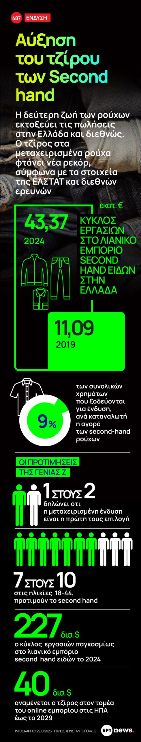 Η δεύτερη ζωή των ρούχων εκτοξεύει τις πωλήσεις στην Ελλάδα και διεθνώς. Ο τζίρος στα μεταχειρισμένα ρούχα φτάνει νέο ρεκόρ, σύμφωνα με τα στοιχεία της ΕΛΣΤΑΤ και διεθνών ερευνών.