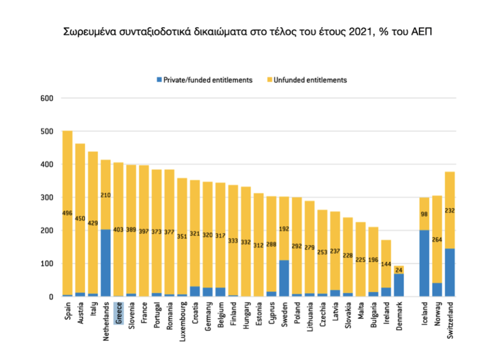 Ωστόσο, η Ελλάδα εξακολουθεί να έχει ένα από τα υψηλότερα ποσοστά αναπλήρωσης συντάξεων. Πάνω από 90% έναντι του μέσου όρου ΕΕ γύρω στο 60%. Γεγονός που διατηρεί τις δημοσιονομικές πιέσεις υψηλές. Ταυτόχρονα υστερεί σημαντικά στον θεσμό των ιδιωτικών κεφαλαιοποιητικών συντάξεων.