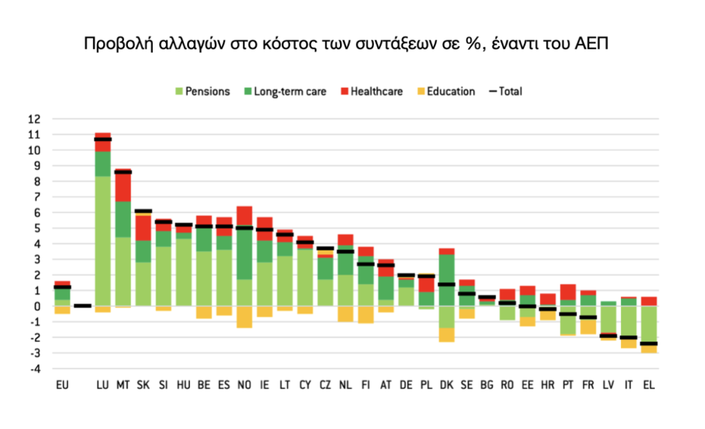 Οι συντάξεις αποτελούν τον βασικό μοχλό των αυξήσεων δημοσίων δαπανών λόγω γήρανσης, ακολουθούμενες από τη φροντίδα μακράς διάρκειας. Oι δαπάνες υγείας, αντίθετα, αυξάνονται ομοιόμορφα και πιο ήπια στις χώρες.