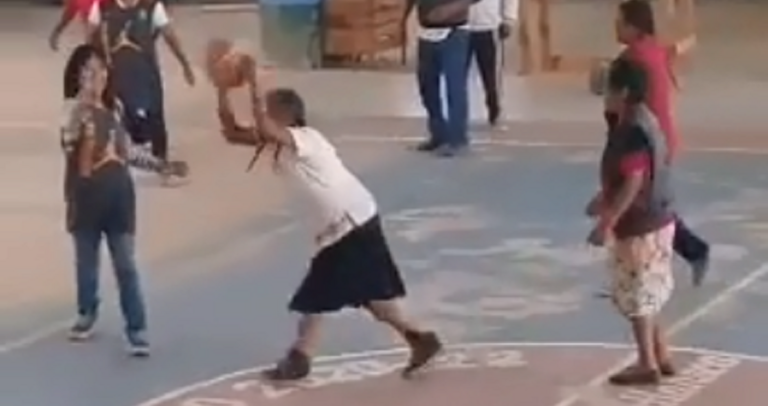 Στο βίντεο, η κυρία Λόπες, με τα γκρίζα της μαλλιά πλεγμένα σε δυο μακριές κοτσίδες και φορώντας μακριά φούστα, κάνει προσποίηση για να εξουδετερώσει αμυντικό κοντά στο καλάθι προτού βρει χώρο και σκοράρει αξιοποιώντας άψογα το ταμπλό.