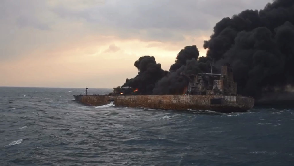 Στο δεξαμενόπλοιο Sanchi, το οποίο μετέφερε 136.000 τόνους ελαφρών υδρογονανθράκων, εκδηλώθηκε πυρκαγιά στις 6 Ιανουαρίου αφού συγκρούσθηκε με ένα κινεζικό φορτηγό πλοίο.