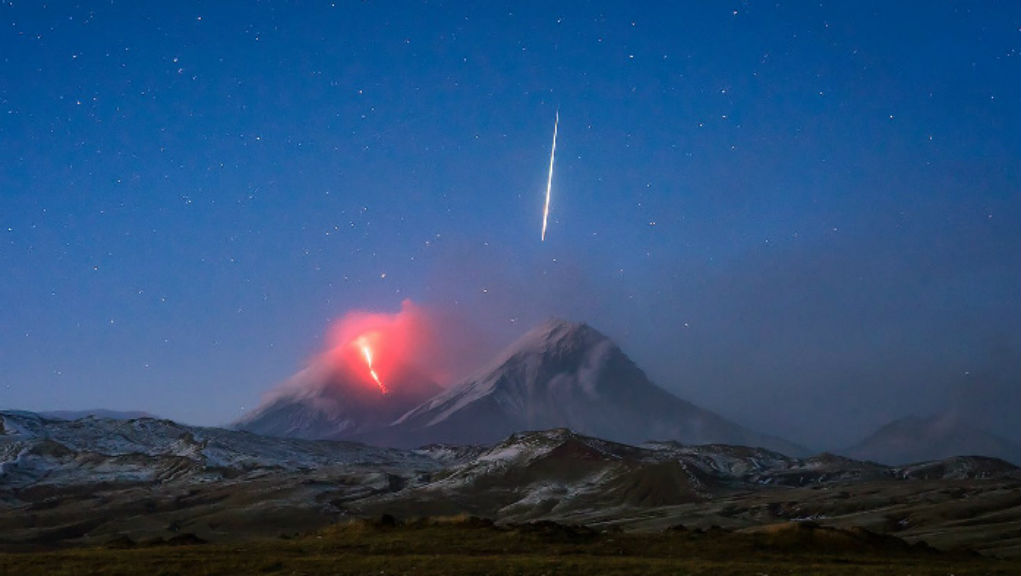 Η φωτογραφία του Tomas van der Weijden είναι μαγική! Ένα ηφαίστειο εκρήγνυται. Ένας φωτεινός μετεωρίτης βουτά από τον ουρανό. Και τα δύο καθρεφτίζονται σε μια λίμνη.
