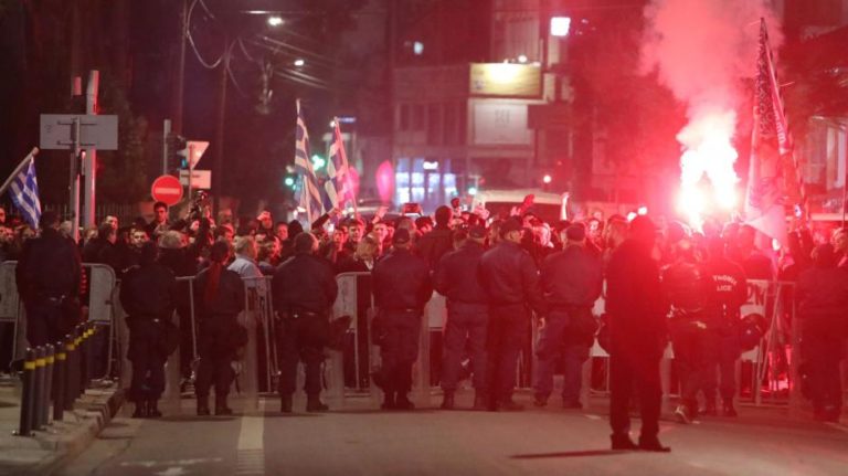 Περίπου 300 διαμαρτυρόμενοι έφτασαν στο σημείο με το σύνθημα “Ζει και μας καθοδηγεί, Γεώργιος Γρίβας Διγενής”.