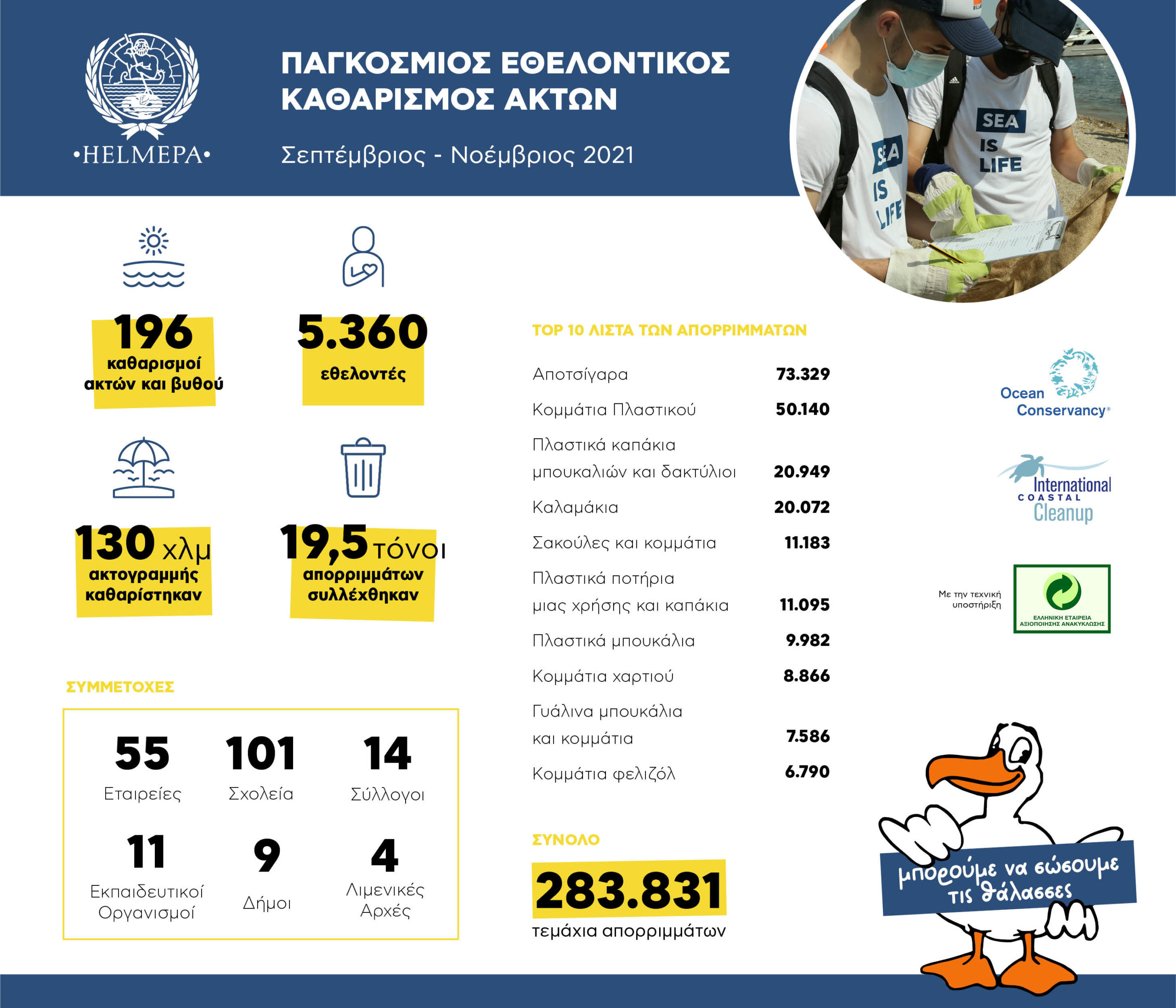 Η Ελληνική Ένωση Προστασίας Θαλάσσιου Περιβάλλοντος – HELMEPA, όπως αναφέρει σε ανακοίνωσή της: «για συνεχή 31η χρονιά, και με την ιδιότητα του Εθνικού Συντονιστή, συντόνισε και υλοποίησε με μεγάλη επιτυχία, τον Παγκόσμιο Εθελοντικό Καθαρισμό Ακτών 2021, που αποτελεί την μεγαλύτερη και πλέον αναγνωρισμένη εκστρατεία στο είδος της για την πρόληψη της ρύπανσης ακτών και θαλασσών με απορρίμματα.