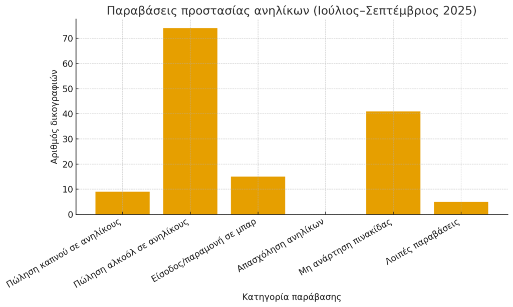 - Η πιο συχνή παράβαση αφορά την πώληση ή διάθεση αλκοόλ σε ανηλίκους, με 74 δικογραφίες και 82 συλλήψεις — σχεδόν το ήμισυ του συνόλου των παραβάσεων.