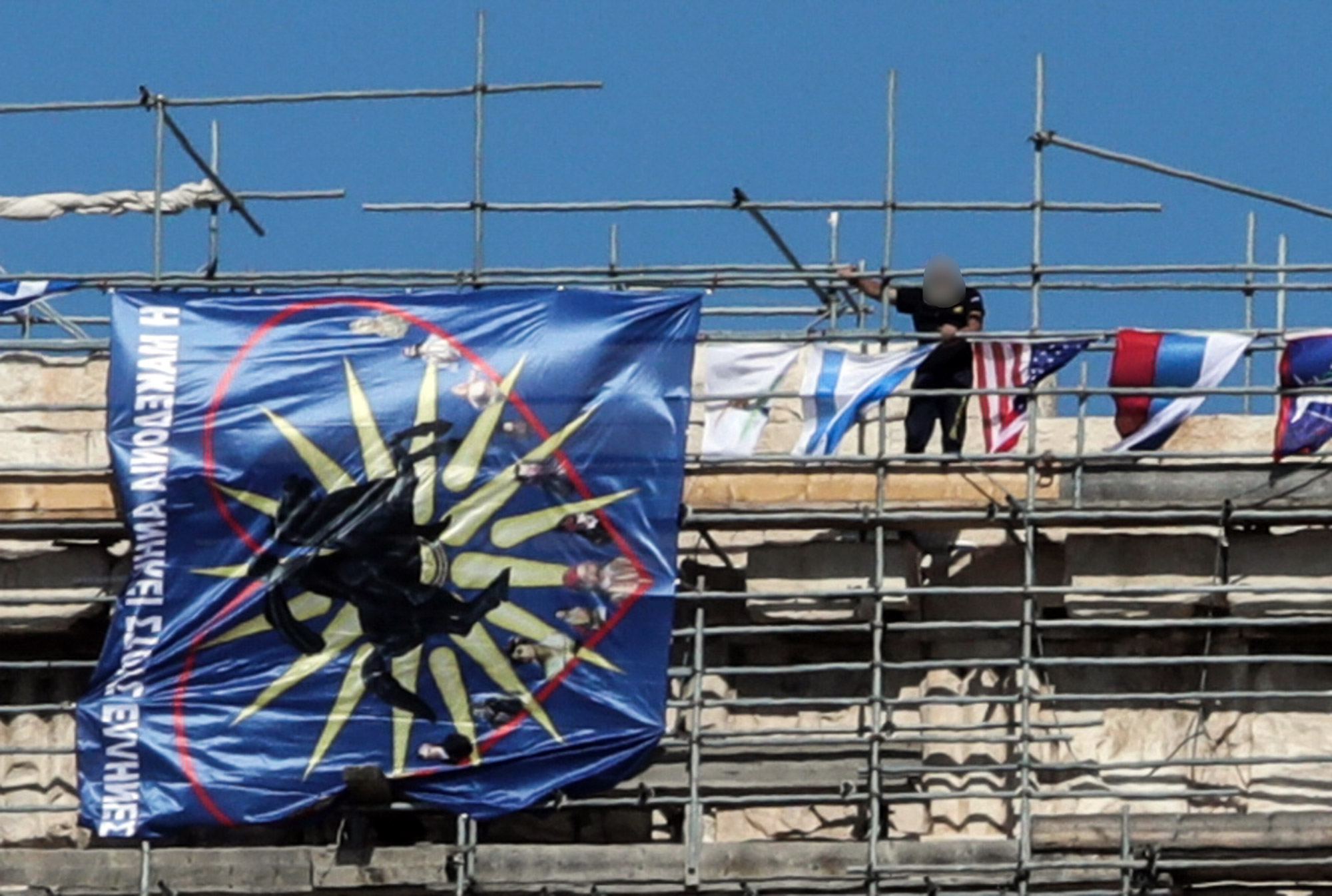 Κατέβηκε, τελικά, ο άνδρας που ανέβηκε σε σκαλωσιά στον Παρθενώνα όπου είχε κρεμάσει σημαίες του Ισραήλ, της Ελλάδας, της Νέας Δημοκρατίας και το αστέρι της Βεργίνας.