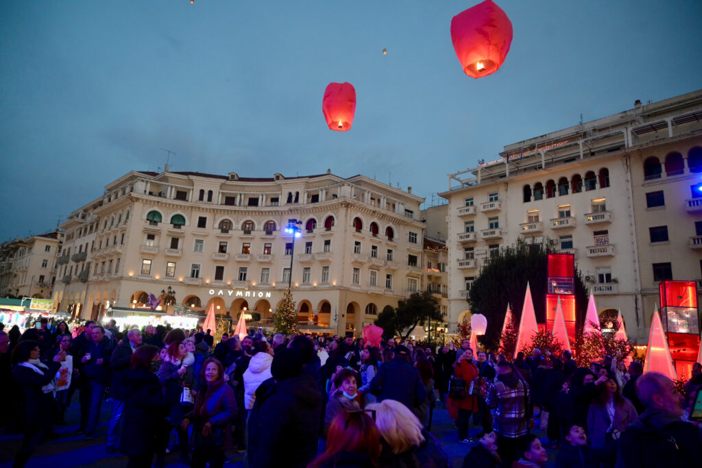 Στην Πλατεία Αριστοτέλους, ο κόσμος αφήνει φαναράκια που ανεβαίνουν στον ουρανό. Όπως λένε, κάθε φανράκι και μία ευχή. Η πρωτοβουλία αυτή ανήκει στον Εμπορικό Σύλλογο Θεσσαλονίκης.