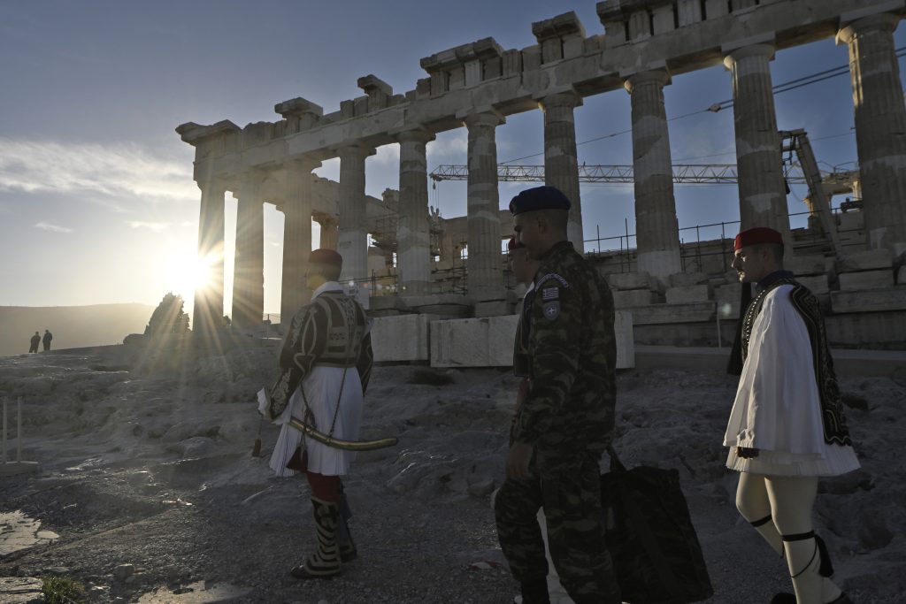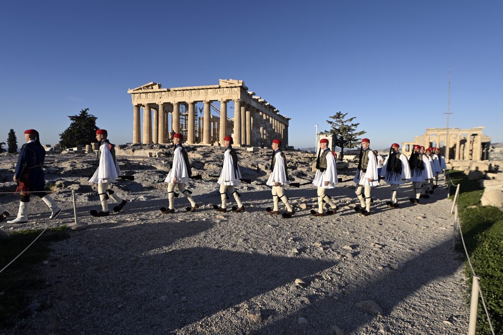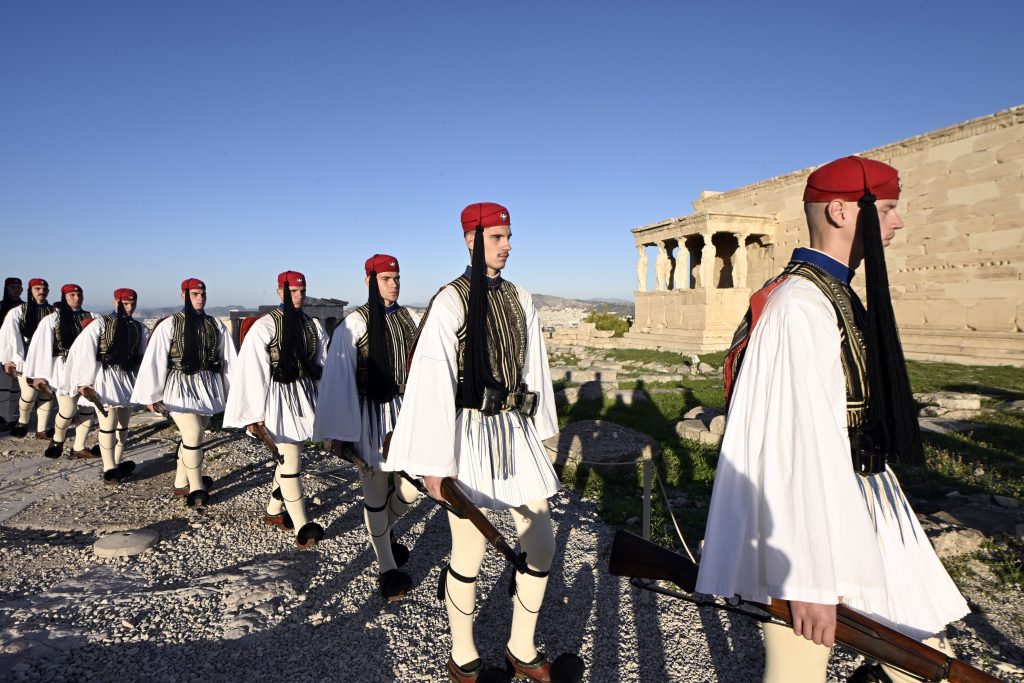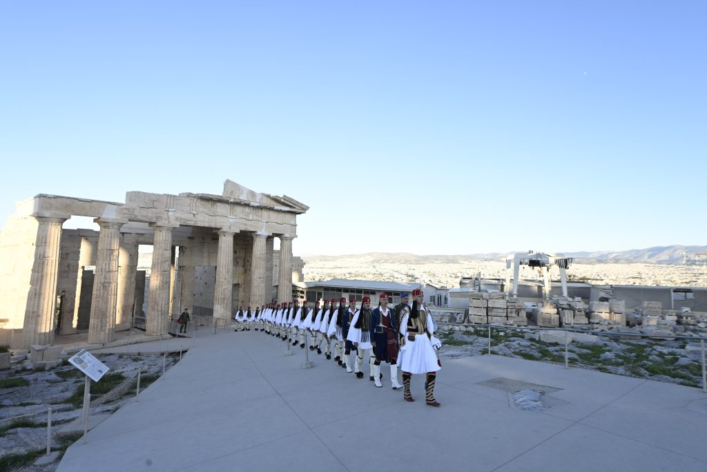 Όσοι βρέθηκαν το πρωί της Τρίτης στον Ιερό Βράχο παρακολούθησαν τους Εύζωνες της Προεδρικής Φρουράς να υψώνουν στον ιστό τη σημαία και άκουσαν την ανάκρουση του εθνικού ύμνου.