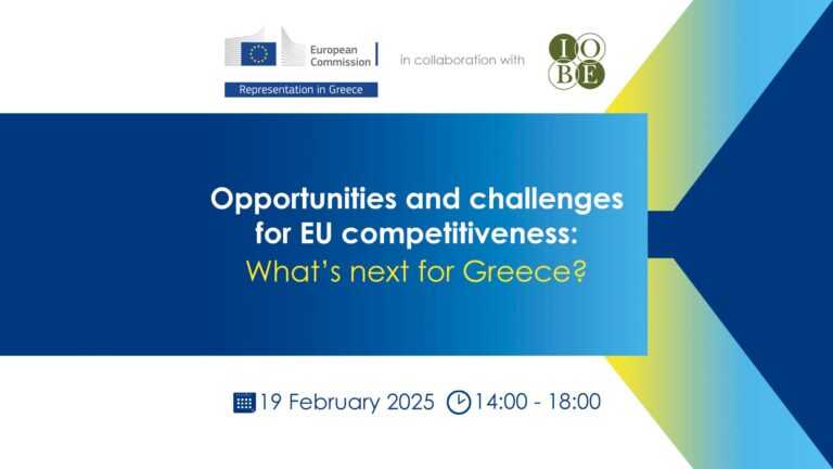 «Ευκαιρίες και προκλήσεις για την ανταγωνιστικότητα της ΕΕ: Τι επιφυλάσσει το μέλλον για την Ελλάδα;» είναι το θέμα της ημερίδας που πραγματοποιεί η Αντιπροσωπεία της Ευρωπαϊκής Επιτροπής στην Ελλάδα, σε συνεργασία με το ΙΟΒΕ, την Τετάρτη, 19 Φεβρουαρίου, από τις 14:00 έως τις 18:00.