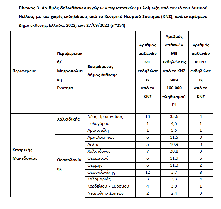 Συνολικά έχουν διαγνωστεί στην Ελλάδα, από την αρχή της περιόδου 2022, μέχρι 27 Σεπτεμβρίου, 254 εγχώρια κρούσματα λοίμωξης από τον ιό του Δυτικού Νείλου, εκ των οποίων τα 166 παρουσίασαν εκδηλώσεις από το Κεντρικό Νευρικό Σύστημα (ΚΝΣ, εγκεφαλίτιδα ή/και μηνιγγίτιδα ή/και οξεία χαλαρή παράλυση) και 88 είχαν ήπιες εκδηλώσεις (πχ εμπύρετο νόσημα)/δεν είχε εκδηλώσεις από το ΚΝΣ.