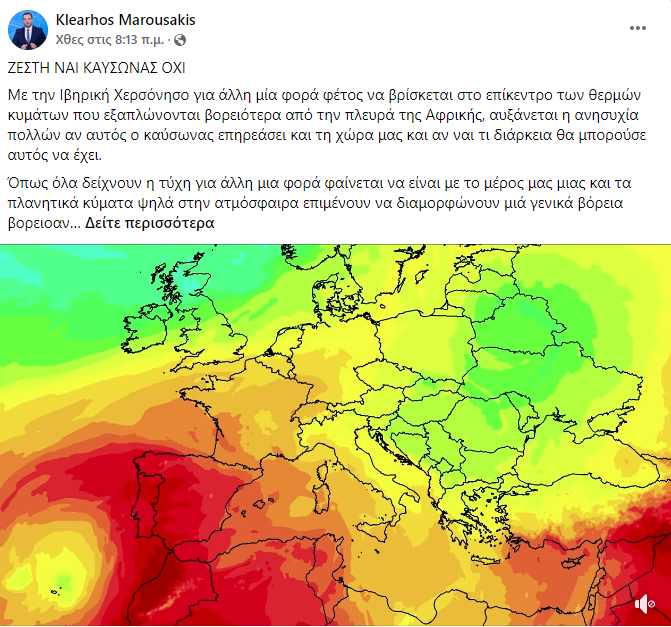 Ο μετεωρολόγος Κλέαρχος Μαρουσάκης, σε ανάρτησή του στο Facebook, γράφει «Ζέστη ναι, καύσωνας όχι»