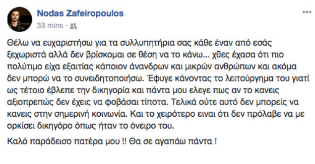 Ο Μιχάλης Ζαφειρόπουλος ήταν πατέρας δυο παιδιών. Ο 23χρονος γιος του Νώντας έγραψε στο facebook: