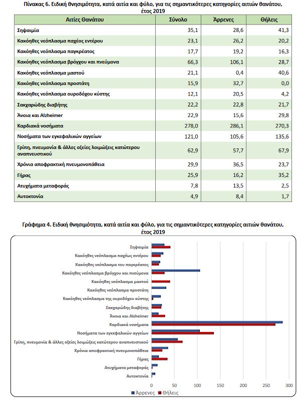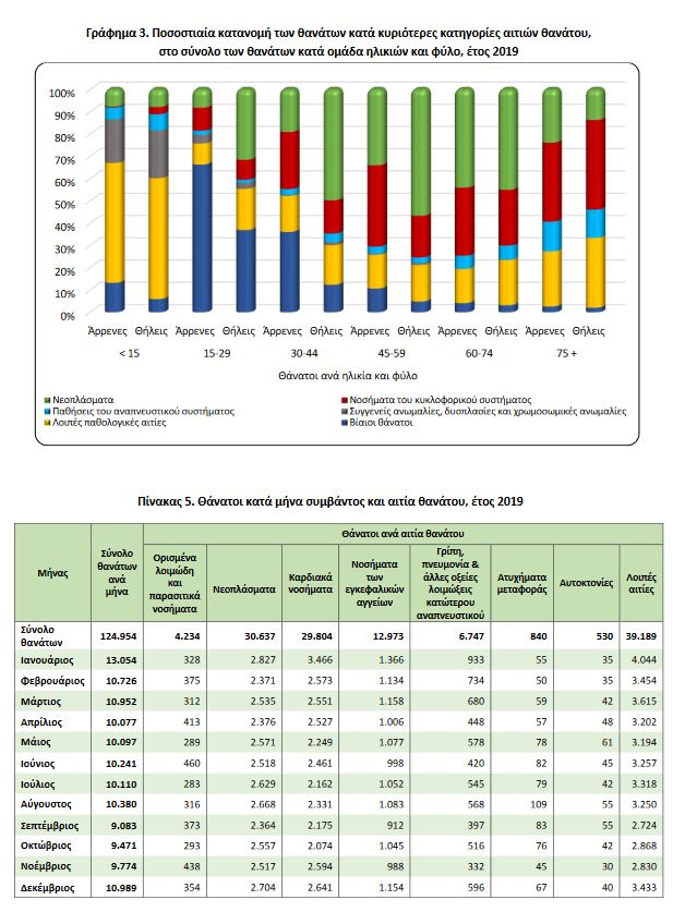 Τα στατιστικά στοιχεία που αποτυπώνουν τις αιτίες θανάτου για το έτος 2019 ανακοίνωσε η Ελληνική Στατιστική Αρχή (ΕΛΣΤΑΤ). Πηγή των στοιχείων αυτών είναι τα πιστοποιητικά θανάτου που υποβάλλουν οι ιατροί και για τις περιπτώσεις βίαιων ή αιφνίδιων θανάτων, οι Ιατροδικαστικές Υπηρεσίες.
