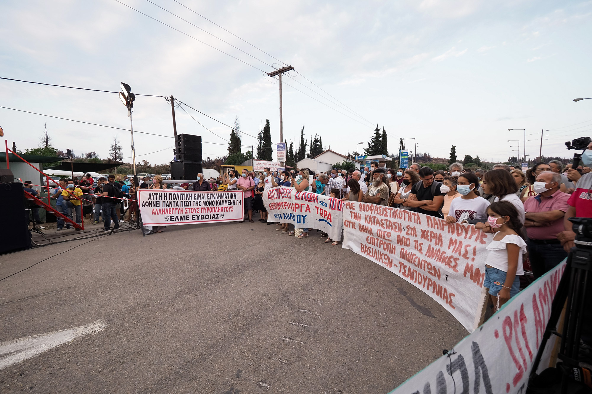 Με συμμετοχή απ’ όλα τα καμένα χωριά της Εύβοιας, η προσέλευση των διαμαρτυρόμενων πυρόπληκτων ήταν πολύ μεγάλη στη «δήλωση αγώνα και αλληλεγγύης» που διοργάνωσαν τα σωματεία ρητινοκαλλιεργητών, των δασεργατών, ο αγροτικός σύλλογος του Μαντουδίου και επιτροπές αγώνα από τα πυρόπληκτα χωριά αργά το απόγευμα του Σαββάτου στη Στροφυλιά της Εύβοιας.