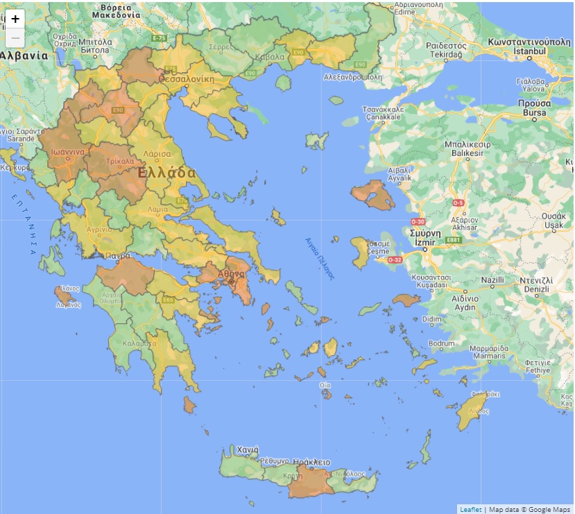 Σύμφωνα με τον Χάρτη Υγειονομικής Ασφάλειας και Προστασίας, από τις 74 Περιφερειακές Ενότητες οι 27 ανήκουν στο επίπεδο 1, (σε ετοιμότητα), 25 βρίσκονται στο επίπεδο 2, (σε κατάσταση επιτήρησης), και 22 στο επίπεδο 3, (σε κατάσταση δηλαδή αυξημένης επιτήρησης), ενώ καμία δεν βρίσκεται σε κατάσταση αυξημένου κινδύνου (επίπεδο 4).