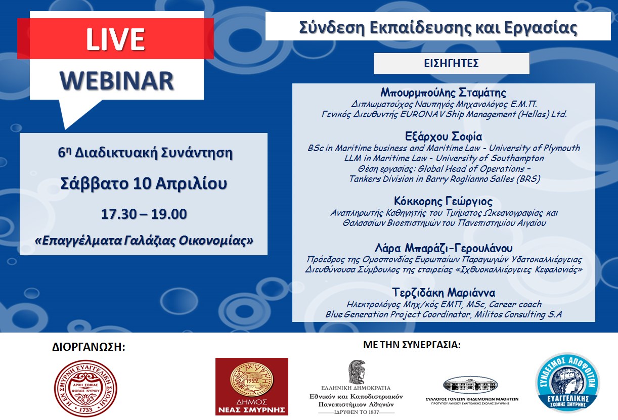 Στο πλαίσιο των διαδικτυακών εκδηλώσεων επαγγελματικού προσανατολισμού και της σύνδεσης της Εκπαίδευσης με την Εργασία, που οργανώνονται από το Πρότυπο Γενικό Λύκειο σε συνεργασία με τον Δήμο Νέας Σμύρνης, τον Σύλλογο Γονέων και Κηδεμόνων Λυκείου Ευαγγελικής Σχολής, τον Σύνδεσμο Αποφοίτων Ευαγγελικής Σχολής και το Παιδαγωγικό Τμήμα Δευτεροβάθμιας Εκπαίδευσης του Εθνικού και Καποδιστριακού Πανεπιστημίου Αθηνών (ΕΚΠΑ), θα πραγματοποιηθεί η 6η διαδικτυακή συνάντηση με θέμα: «Τα επαγγέλματα της γαλάζιας οικονομίας» το Σάββατο 10 Απριλίου 2021 (17:30 – 19:00).