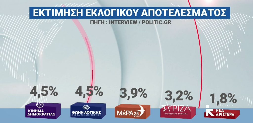 Στην εκτίμηση εκλογικού αποτελέσματος, η Νέα Δημοκρατία φτάνει στο 29,3%, με το ΠΑΣΟΚ να ακολουθεί στο 16%.