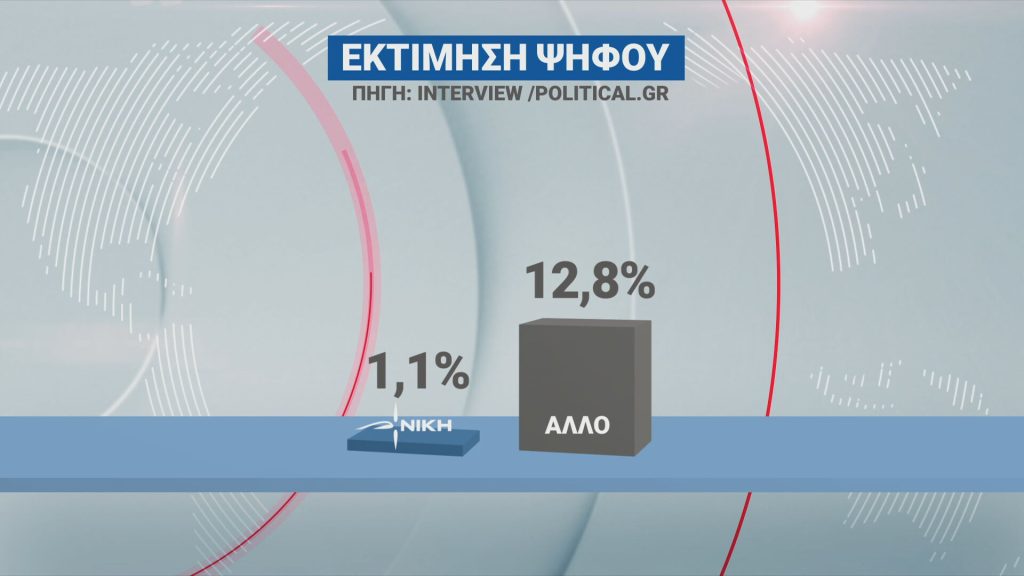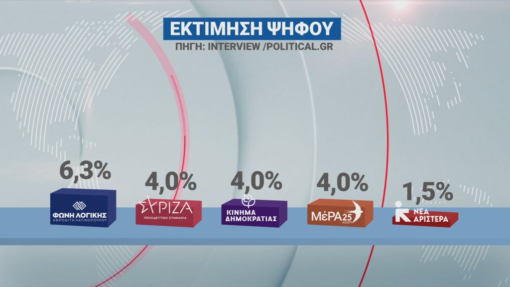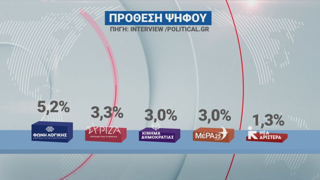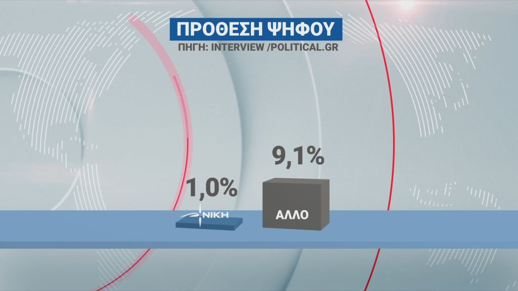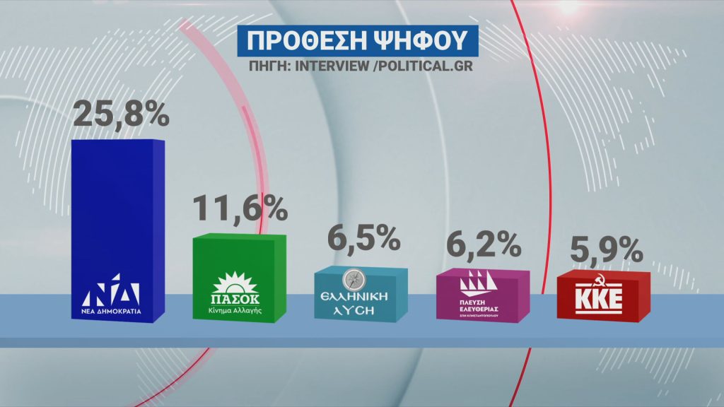 Στην πρόθεση ψήφου το κυβερνών κόμμα λαμβάνει ποσοστό 25,8% με τάση ανόδου και το ΠΑΣΟΚ 11,6%. Στην εκτίμηση του εκλογικού αποτελέσματος η ΝΔ ξεπερνά το όριο του 30% επιτυγχάνοντας τον στρατηγικό εκλογικό της στόχο.