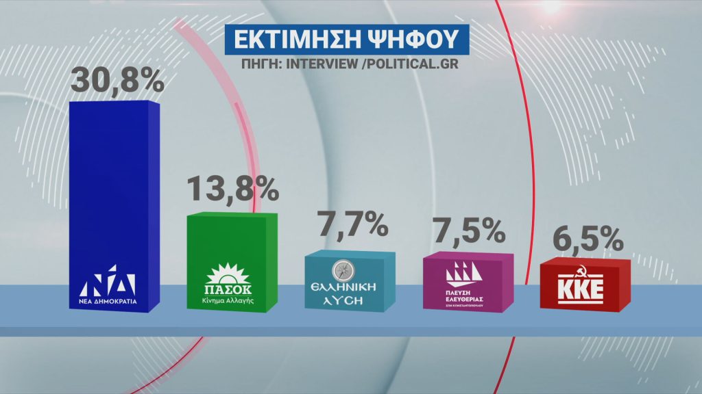 Προβάδισμα 13 μονάδων έναντι του ΠΑΣΟΚ που βρίσκεται στη δεύτερη θέση, δίνει στη ΝΔ η δημοσκόπηση της Interview για λογαριασμό της εφημερίδα Political.