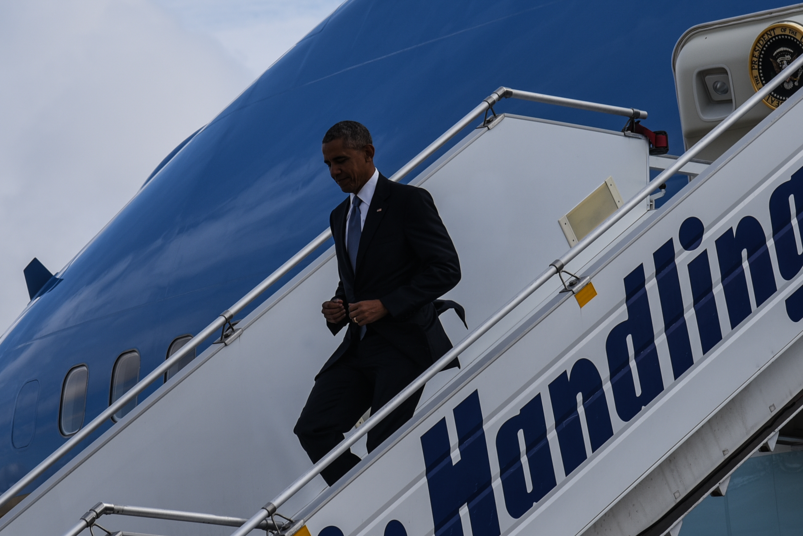 Ο Μπαράκ Ομπάμα κατέβηκε εύχαρης και χαμογελαστός από το προεδρικό αεροσκάφος.