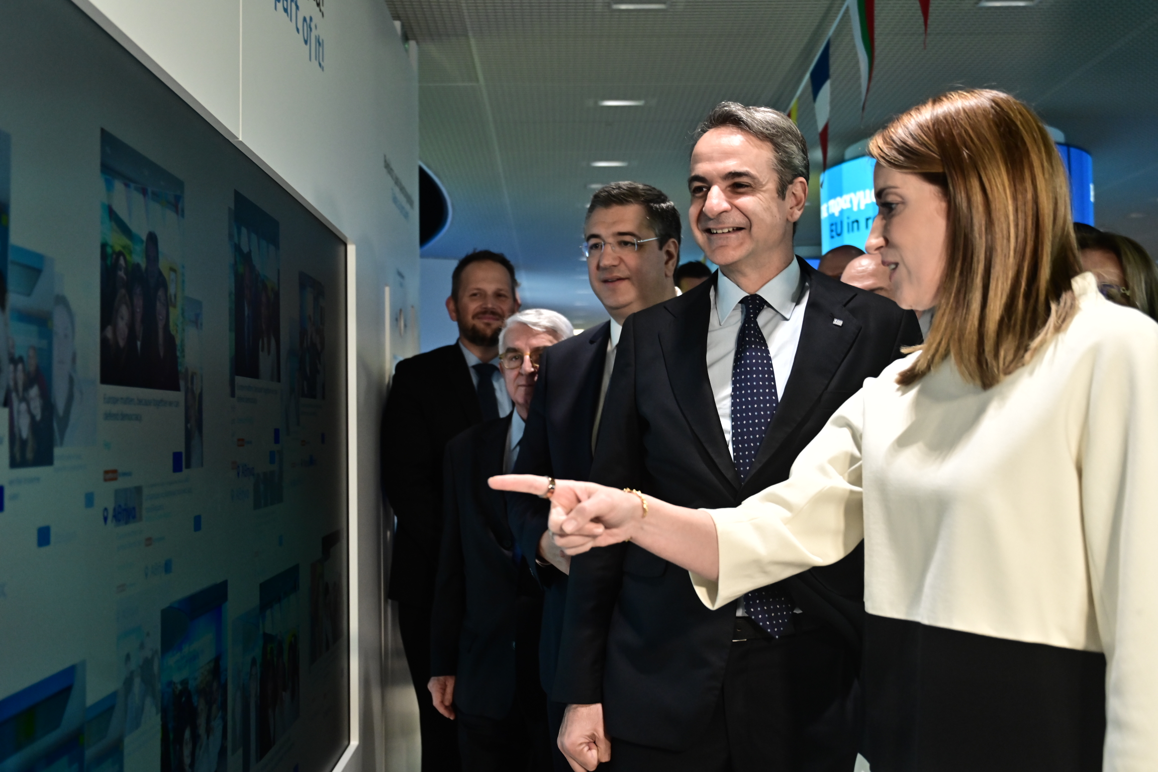 Ο Πρωθυπουργός ξεναγήθηκε, μαζί με την κα Metsola και τον Ευρωπαίο Επίτροπο Βιώσιμων Μεταφορών και Τουρισμού Απόστολο Τζιτζικώστα, στις εγκαταστάσεις του κέντρου, όπου οι επισκέπτες έχουν τη δυνατότητα να ενημερωθούν, μέσα από διαδραστικές εμπειρίες και ψηφιακά εργαλεία, για τον τρόπο λειτουργίας της Ευρωπαϊκής Ένωσης, τις πρωτοβουλίες και τον ρόλο των θεσμών της και την επίδραση των ευρωπαϊκών πολιτικών στην καθημερινότητα των πολιτών, ενώ παράλληλα προσφέρονται χώροι συζήτησης και διδασκαλίας.