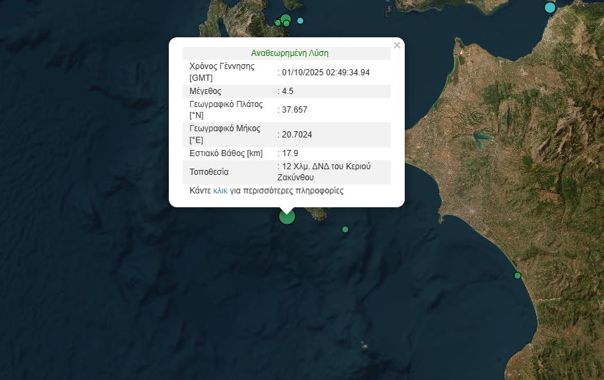Σεισμός μεγέθους 4,5 βαθμών της κλίμακας Ρίχτερ σημειώθηκε στις 05:49 τα ξημερώματα της Τετάρτης στα ανοιχτά της Ζακύνθου.