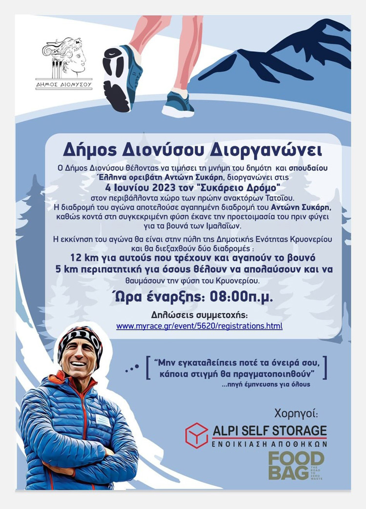 Τιμώντας τη μνήμη του του δημότη Διονύσου και σπουδαίου Έλληνα ορειβάτη Αντώνη Συκάρη, ο Δήμος Διονύσου διοργανώνει την Κυριακή 4 Ιουνίου 2023 στις 8 π.μ. τον «Συκάρειο Δρόμο» στην περιοχή του Κρυονερίου προς την Βαρυμπόμπη, στον περιβάλλοντα χώρο των πρώην ανακτόρων Τατοΐου.