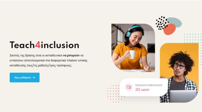 Το https://teach4inclusion.gr απευθύνεται σε εκπαιδευτικούς που διδάσκουν σε τάξεις με μαθητές πρόσφυγες, μετανάστες και ευάλωτους πληθυσμούς, παρέχοντας ένα 30ωρο Ανοικτό Διαδικτυακό Μάθημα (MOOC) για τη συμπεριληπτική εκπαίδευση. Μέσα από 12 ενότητες και 32 μαθήματα, 280 σύντομα βίντεο, ερωτήσεις αυτοαξιολόγησης καθώς και πρόσθετες πηγές, παρέχεται στους εκπαιδευτικούς η απαραίτητη υποστήριξη για πιο ολοκληρωμένη κατανόηση βασικών θεμάτων της ενταξιακής εκπαίδευσης. Oι θεματικές αφορούν στα δικαιώματα του παιδιού, τη διαφοροποιημένη διδασκαλία, τη διδασκαλία της ελληνικής ως δεύτερης γλώσσας, την ένταξη μαθητών με αναπηρίες και ειδικές εκπαιδευτικές ανάγκες, καθώς και τις βασικές αρχές της συμπεριληπτικής εκπαίδευσης.
