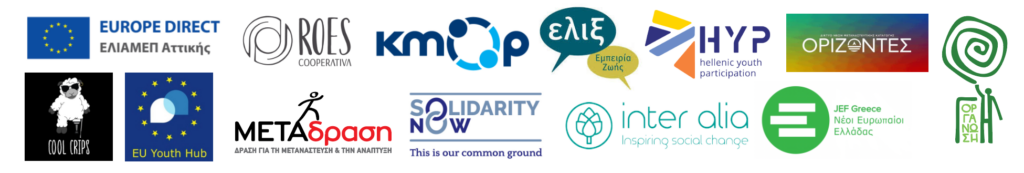 Cool Crips / EU Youth Hub / Europe Direct / Hellenic Youth Participation / Inter Alia / JEF Greece / ΜΕΤΑδραση / Roes Cooperativa / Solidarity Now / ΕΛΙΞ / ΚΜΟΠ – Κέντρο Κοινωνικής Δράσης και Καινοτομίας / Οργάνωση Γη / ΟΡΙΖΟΝΤΕΣ – Δίκτυο Νέων Μεταναστευτικής Καταγωγής