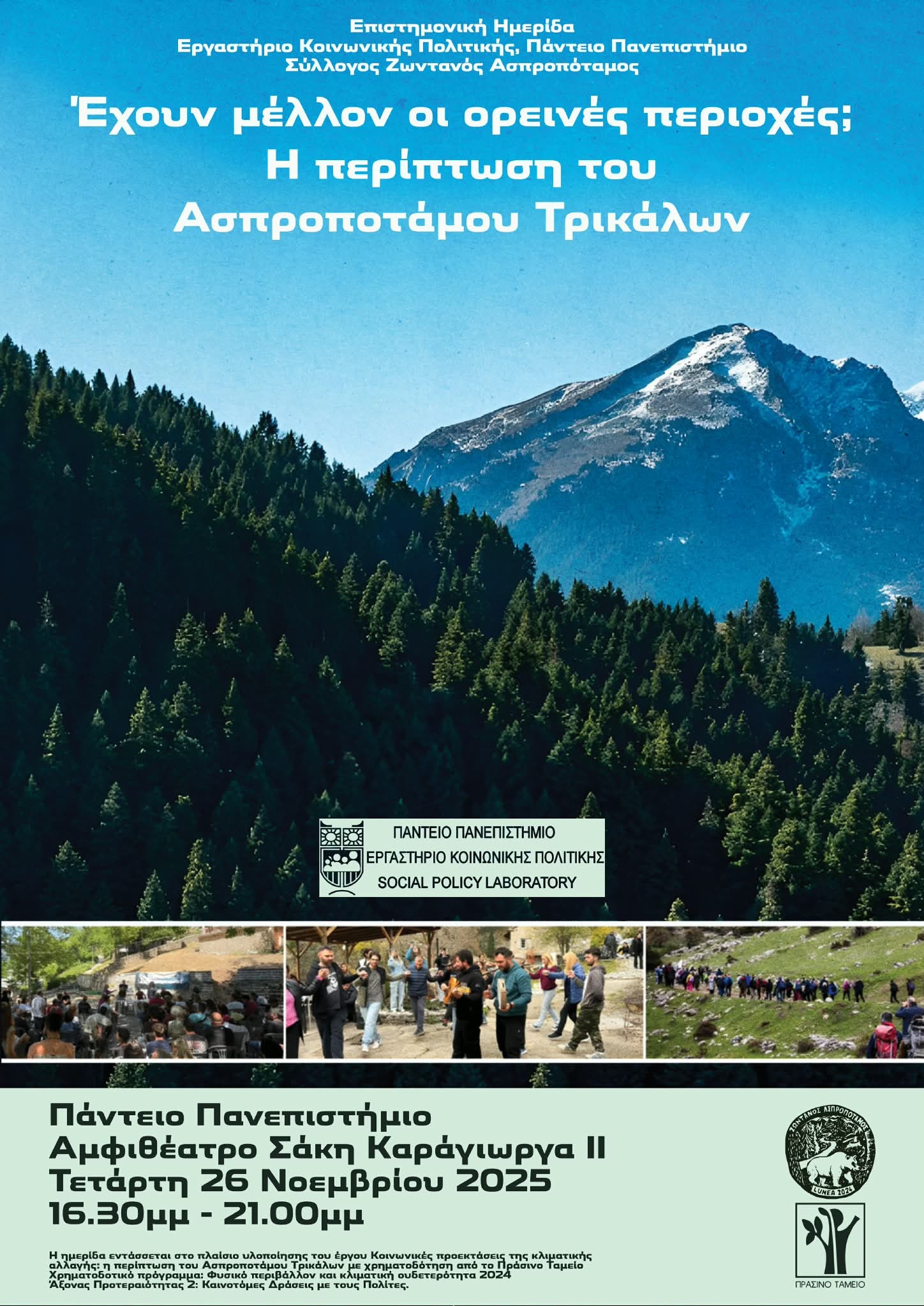 Mε τίτλο το ερώτημα αν «έχουν μέλλον οι ορεινές περιοχές; Η περίπτωση του Ασπροποτάμου Τρικάλων Θεσσαλίας», θα διεξαχθεί επιστημονική Ημερίδα από το Εργαστήριο Κοινωνικής Πολιτικής στο Πάντειο Πανεπιστήμιο και τον Σύλλογο «Ζωντανός Ασπροπόταμος».