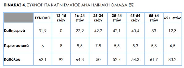 Σχεδόν οι µισοί καπνιστές (46,98%) στην Ελλάδα ανήκουν στην ηλικιακή οµάδα 25 – 44 ετών, ενώ ένας στους δέκα ηλικίας 15 – 24 ετών καπνίζει καθηµερινά.