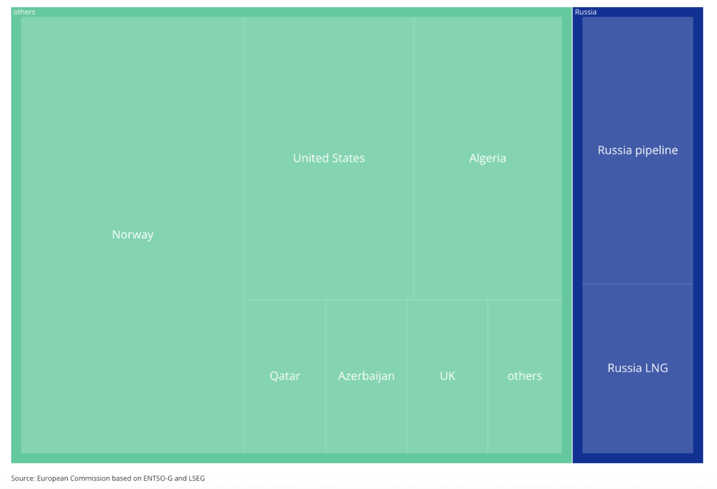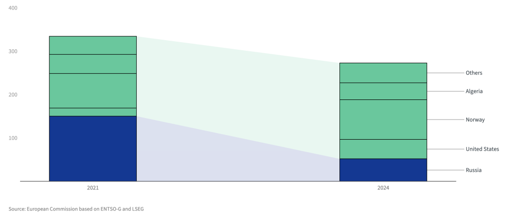 Το μερίδιο της Ρωσίας στις εισαγωγές φυσικού αερίου μέσω αγωγών στην ΕΕ μειώθηκε από πάνω από 40% το 2021 σε περίπου 11% το 2024. Για το φυσικό αέριο μέσω αγωγών και το LNG (ΥΦΑ= Υγροποιημένο Φυσικό Αέριο) μαζί, η Ρωσία αντιπροσώπευε λιγότερο από το 19% των συνολικών εισαγωγών φυσικού αερίου στην ΕΕ το 2024.