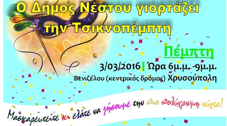 Με σύνθημα «να βγούμε όλοι από τα σπίτια μας αυτή τη νύχτα και να γίνουμε μια παρέα» ο δήμος Νέστου οργανώνει σήμερα (Τσικνοπέμπτη) μια εορταστική βραδιά στη Χρυσούπολη