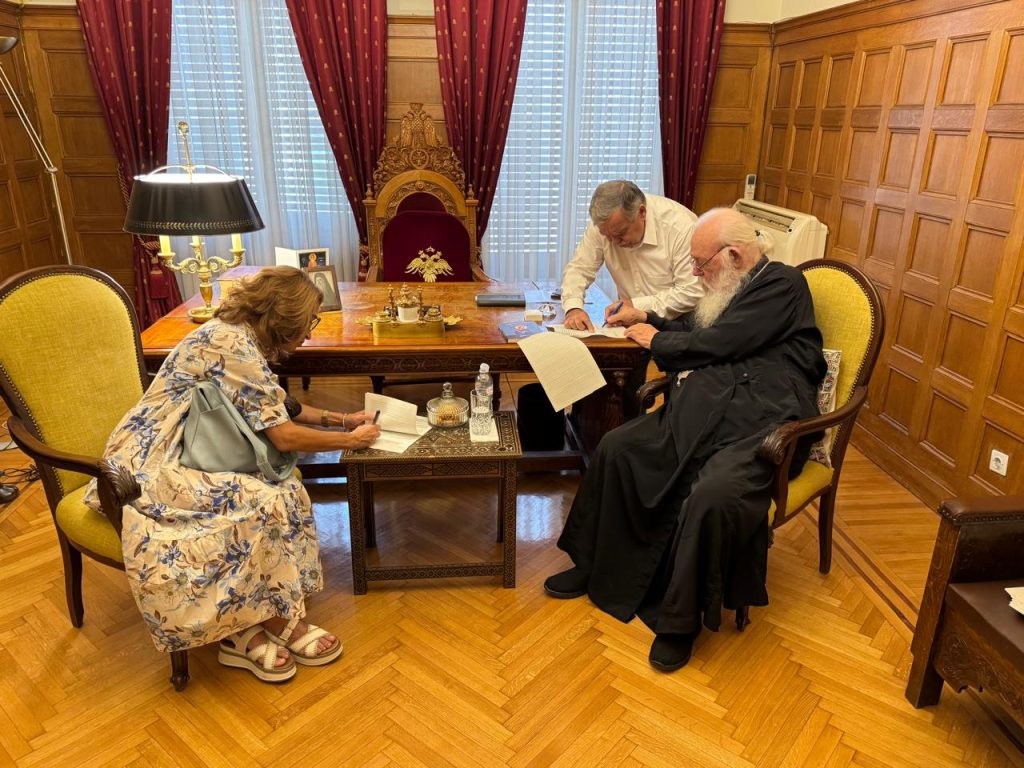 Συμφωνητικό δωρεάν παραχώρησης ακινήτου από το Φιλανθρωπικό Σωματείο «Άγιος Αλέξιος ο άνθρωπος του Θεού» στην Ιερά Αρχιεπισκοπή Αθηνών, υπεγράφη σήμερα από τον Μακαριώτατο Αρχιεπίσκοπο Αθηνών και πάσης Ελλάδος κ. Ιερώνυμο και την Πρόεδρο του Φιλανθρωπικού Σωματείου, κυρία Αλεξάνδρα Παπαζαφειρίου.