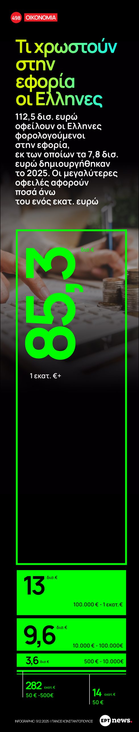 112,5 δισ. ευρώ οφείλουν οι Έλληνες φορολογούμενοι στην εφορία, εκ των οποίων τα 7,8 δισ. ευρώ δημιουργήθηκαν το 2025. Οι μεγαλύτερες οφειλές αφορούν ποσά άνω του ενός εκατ. ευρώ.